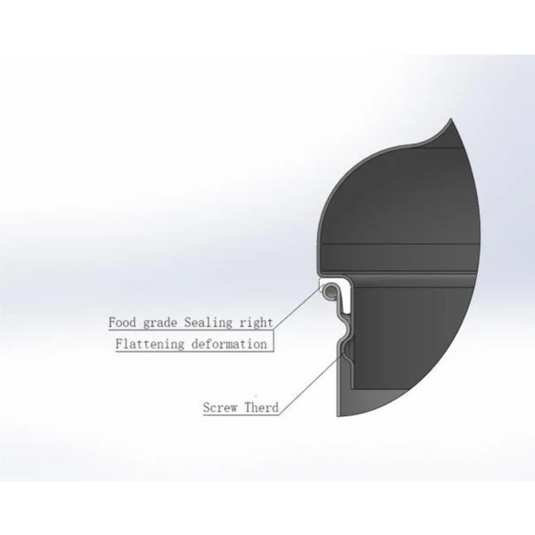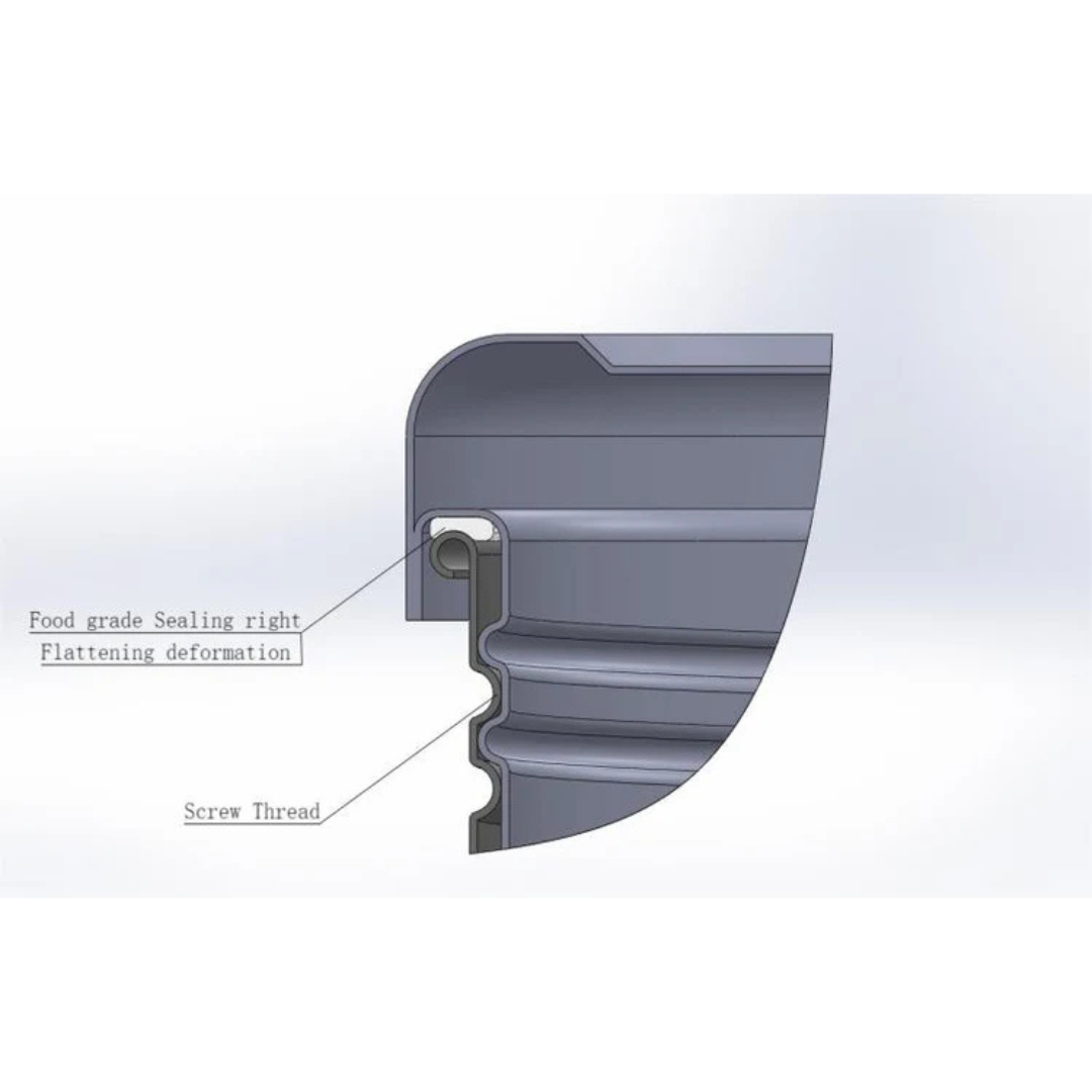 蓋をボトルにねじ込むと、エッジがシリコーンガスケットを圧縮し、気密シールを作ります。これにより、ボトルがしっかりと密閉され、液漏れを防ぎます。