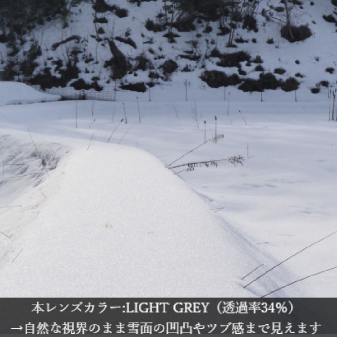 晴天の雪山が長時間続くシーンではやや眩しく感じますが、あらゆるシーンで万能なカラーです。レンズ越しに目が透けるため周囲への威圧感が少なく優しい印象を与えます。