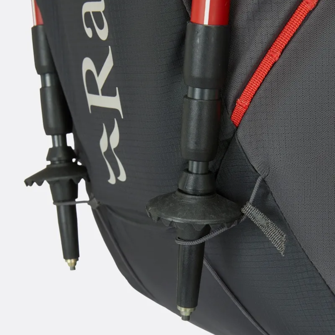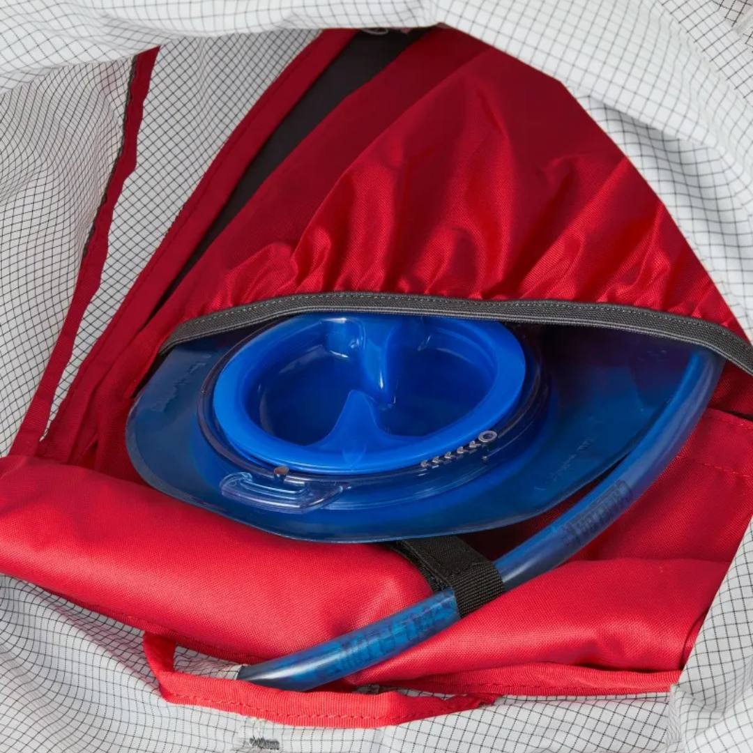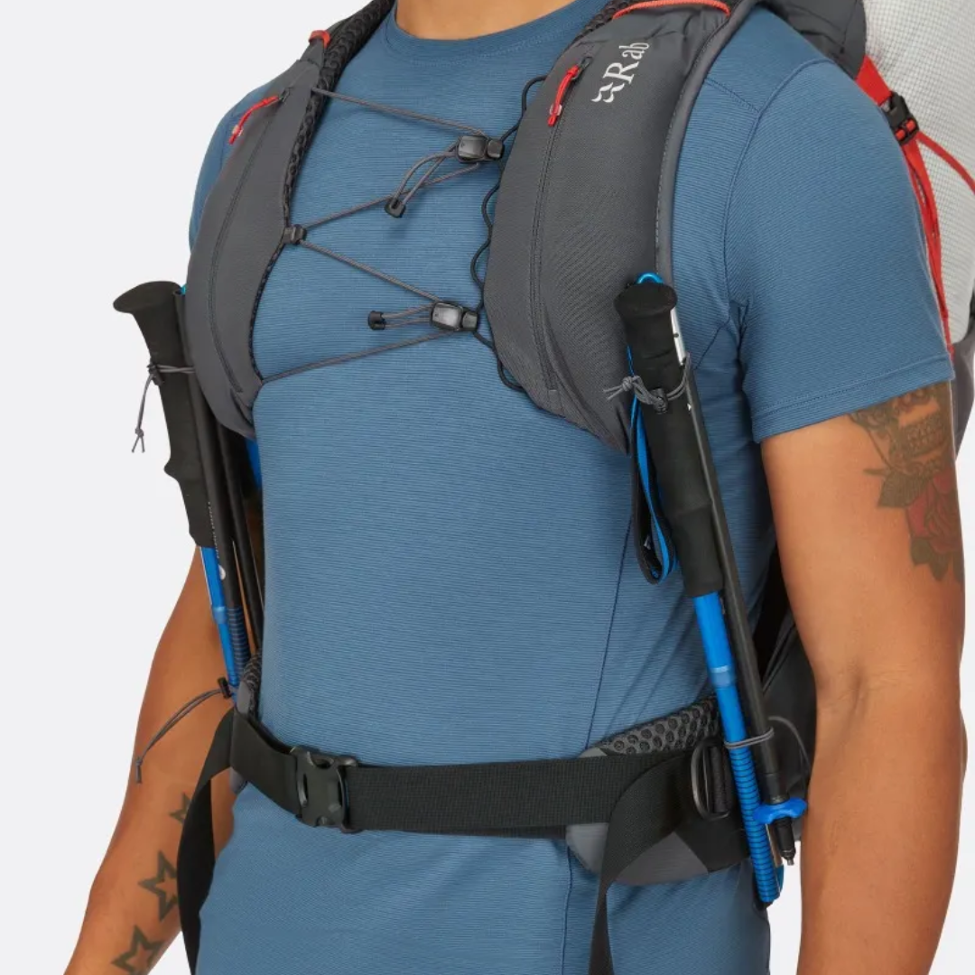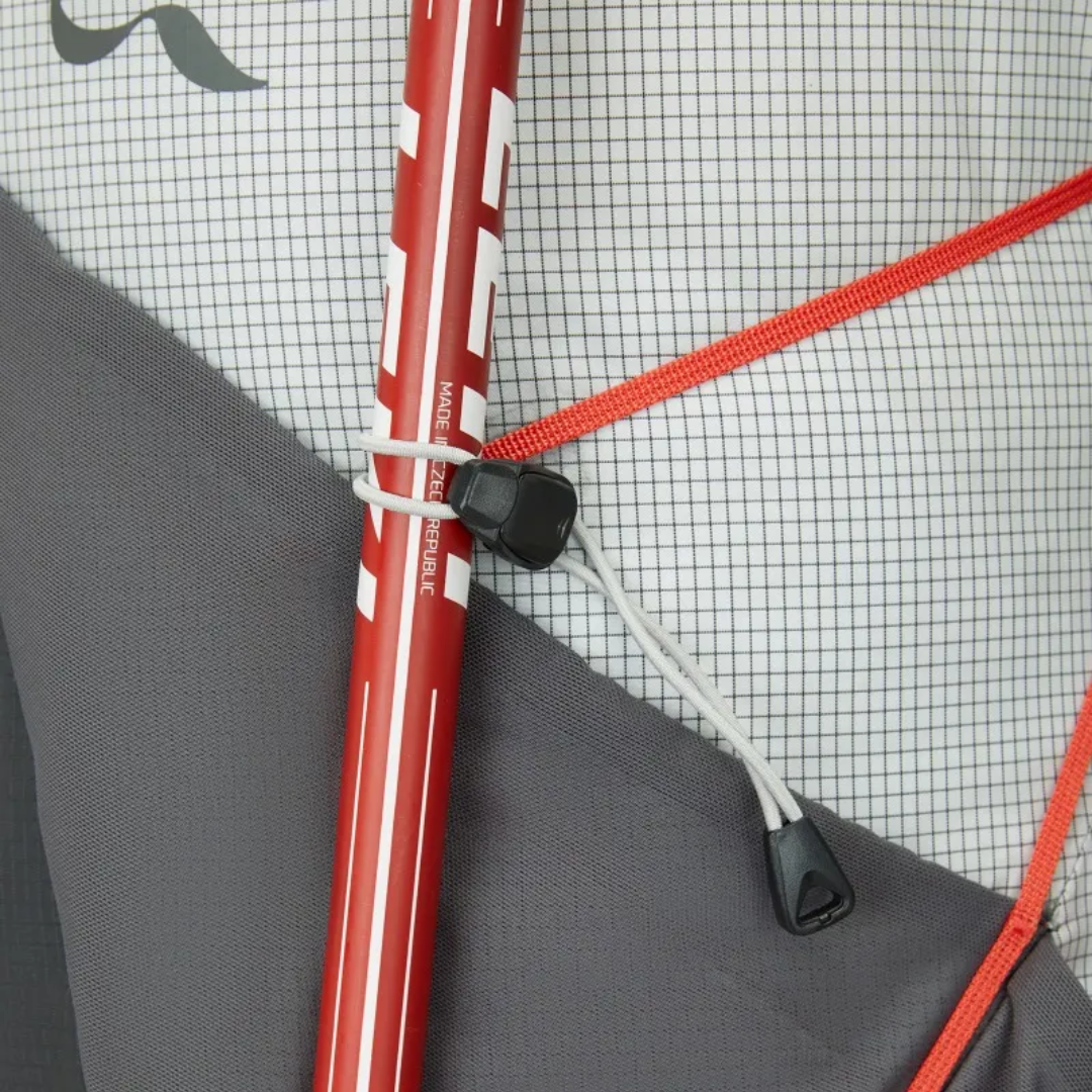 シンプルなロールトップで、素早く簡単にギアを取り出せますし、大型のフロント・メッシュポケットは余分なレイヤーを収納でき、サイドのメッシュポケットとハーネスポケットは水やスナックをすぐに取り出せます。内部には3Lのハイドレーションを収納するスペースもあり、両手を空けたいときはポールをパックの外側に固定することもできます。