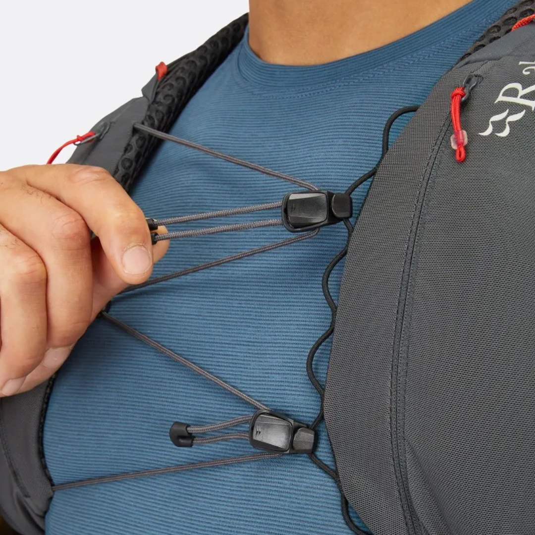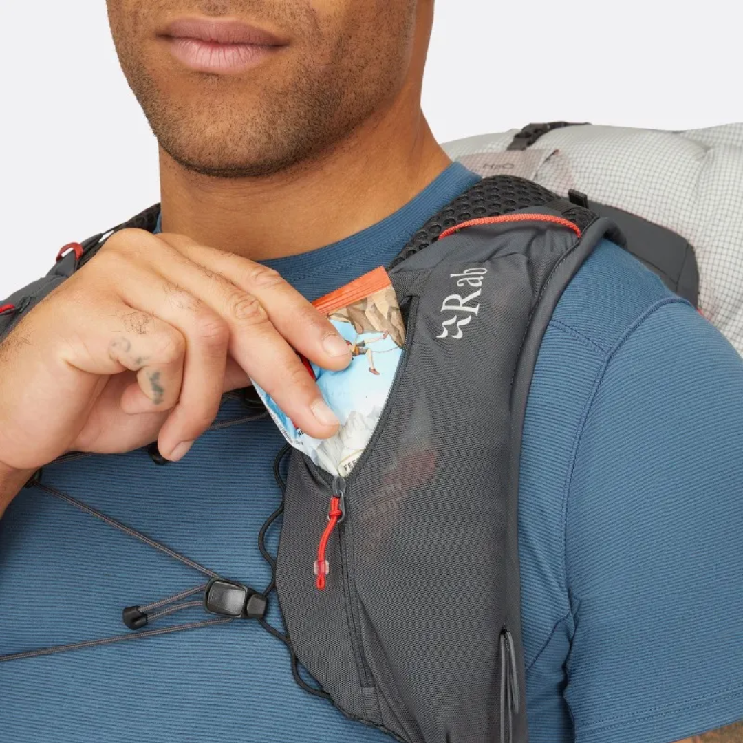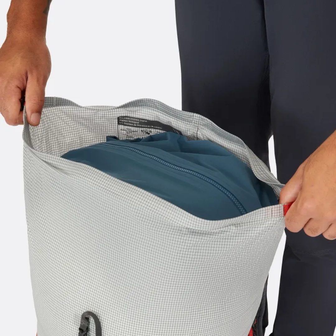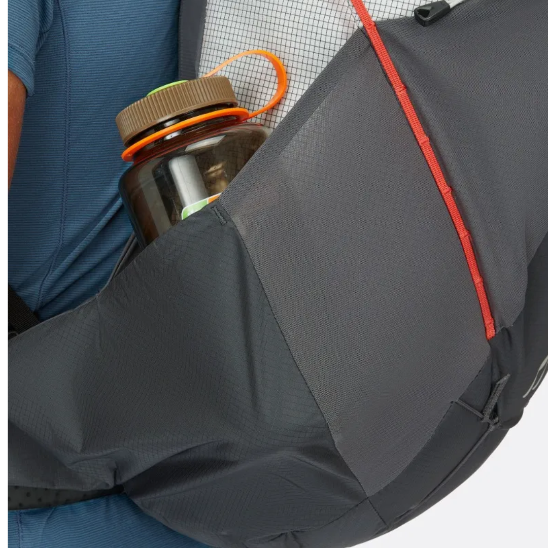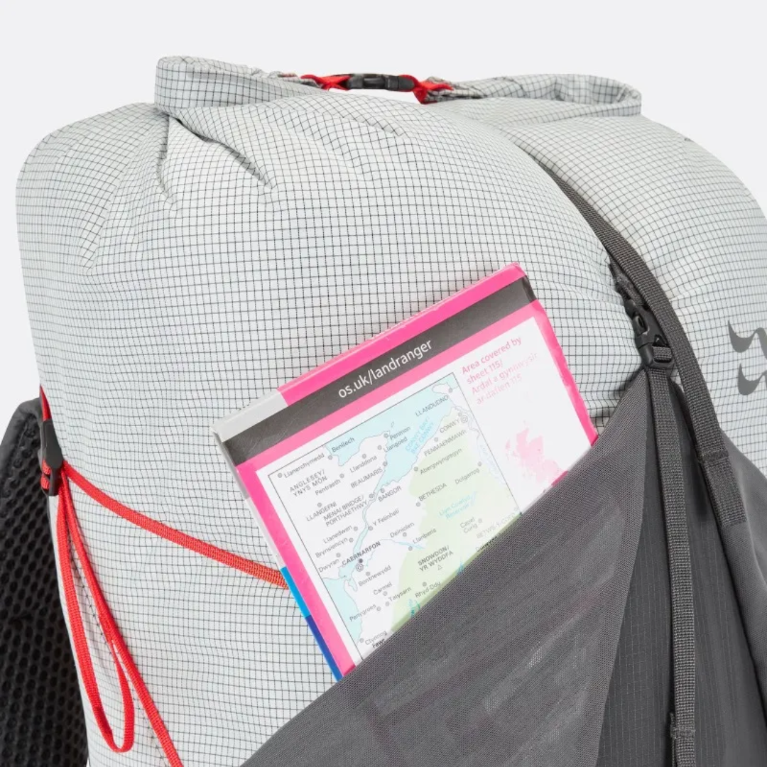 シンプルなロールトップで、素早く簡単にギアを取り出せますし、大型のフロント・メッシュポケットは余分なレイヤーを収納でき、サイドのメッシュポケットとハーネスポケットは水やスナックをすぐに取り出せます。内部には3Lのハイドレーションを収納するスペースもあり、両手を空けたいときはポールをパックの外側に固定することもできます。