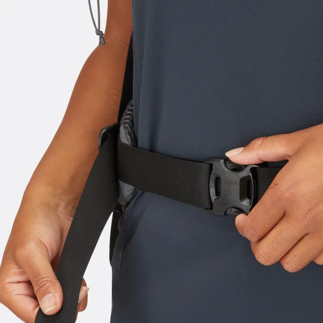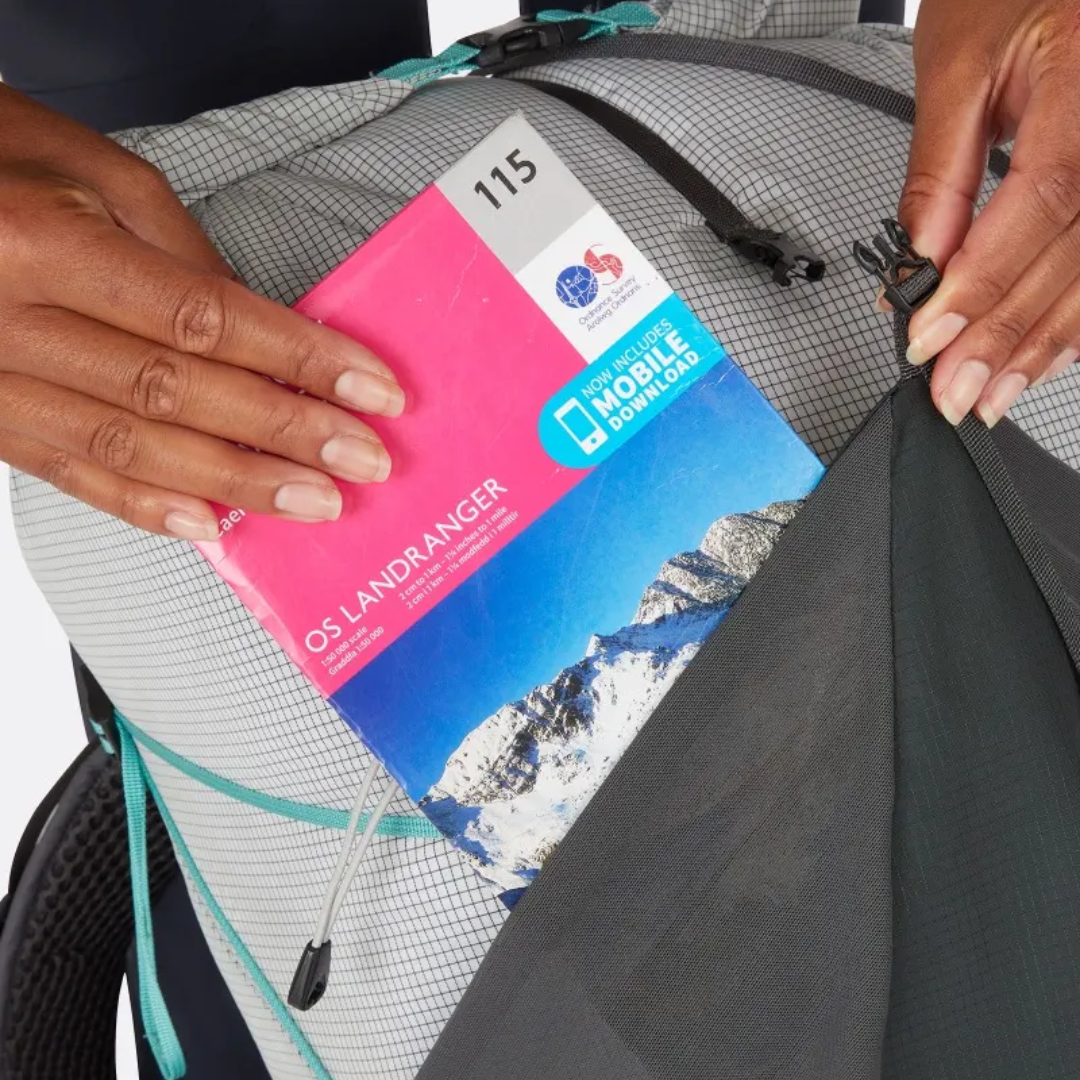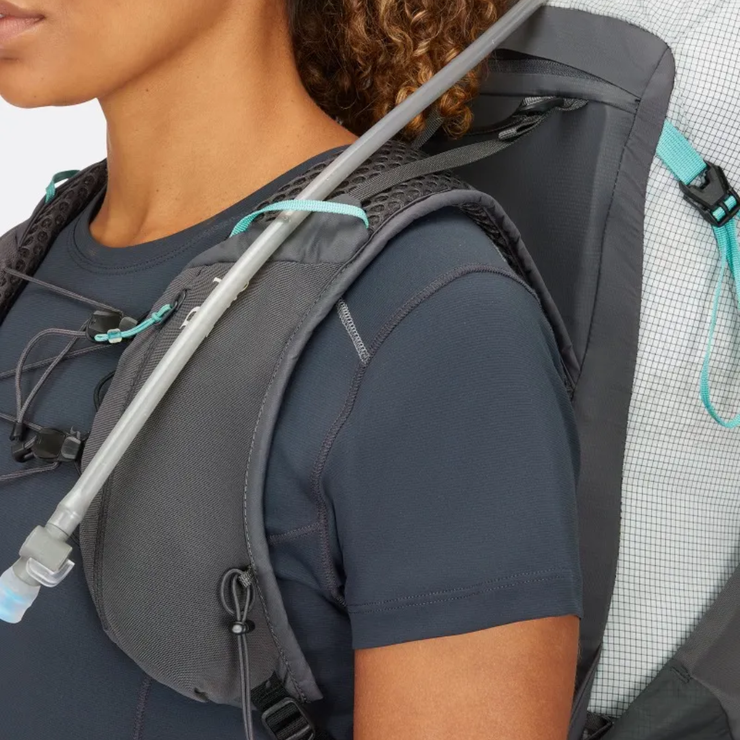 シンプルなロールトップで、素早く簡単にギアを取り出せますし、大型のフロント・メッシュポケットは余分なレイヤーを収納でき、サイドのメッシュポケットとハーネスポケットは水やスナックをすぐに取り出せます。内部には3Lのハイドレーションを収納するスペースもあり、両手を空けたいときはポールをパックの外側に固定することもできます。