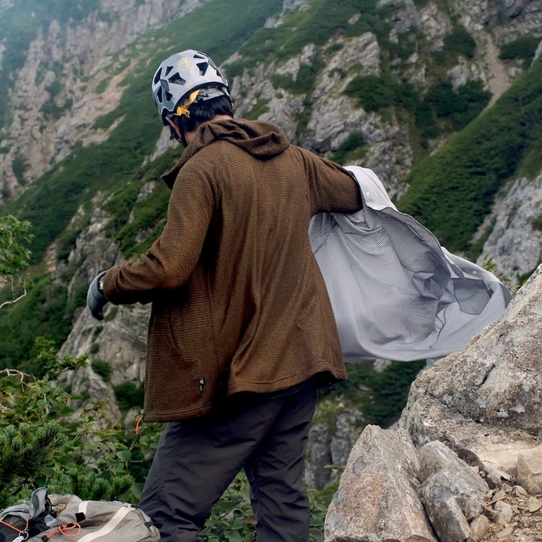 2024年、少しずつ秋が忍び寄る頃の北アルプス縦走には行動着として大活躍してくれました。行動中に体温が上がっても熱がこもらず、それでいて肌寒い稜線ではしっかりと体温をキープしてくれる頼れる存在。まさにこの素材の真価を実感した体験でした。