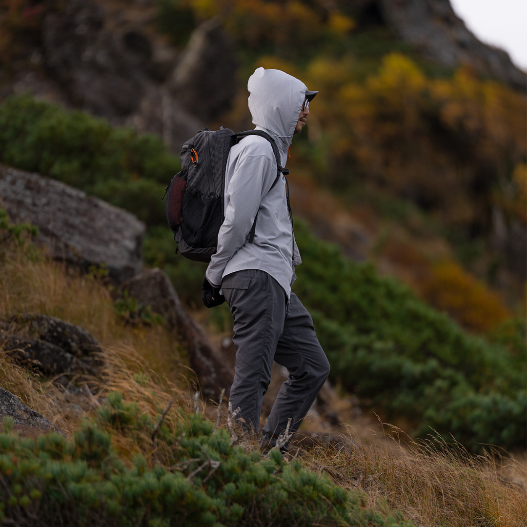 『Hooded Long Sleeve Shirt』は、アウトドアでの実用性を備えつつ、普段の生活でも気負わず使える一枚です。高い通気性と動きやすさがあるため、ハイキングでの快適さをしっかりサポートします。さらに、デザインは過剰な主張を抑え、自然な佇まいを大切にしました。