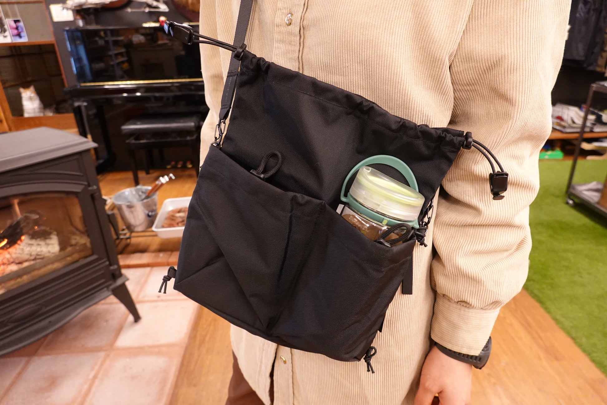 何が2WAYかというと、①バッグを折って使用できる。②バッグを伸ばして使用できるところ。中身によって使い分けられるのが高ポイント。また折って使用した際、背面のジッパーから直接中にアクセスできますので、いちいち伸ばさなくても大丈夫です。伸ばして使用した際は、マップサコッシュのようにトップの口は完全に閉めることができないので、賛否別れる部分だと思います。
