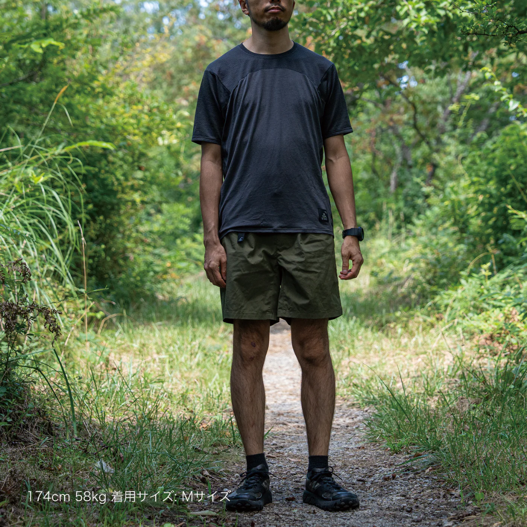 同じ糸から、別々の生地を織りあげ、部分ごとにマッピングしています。より盛夏のアクティビティに適するように背面と脇にメッシュ地を使用し、前身ごろには透けず、肌あたりの良い天竺生地を配置。 フィットは、タイトになり過ぎないアスレチックフィット。腰回りをトリムしミニマルなシルエットにしています。長時間の走行で裾がずり上がり難く、ザックのベストやクライミングハーネス装着時もダブつきが軽減されます。 ウールはノンミュールジングのニュージーランド産。
