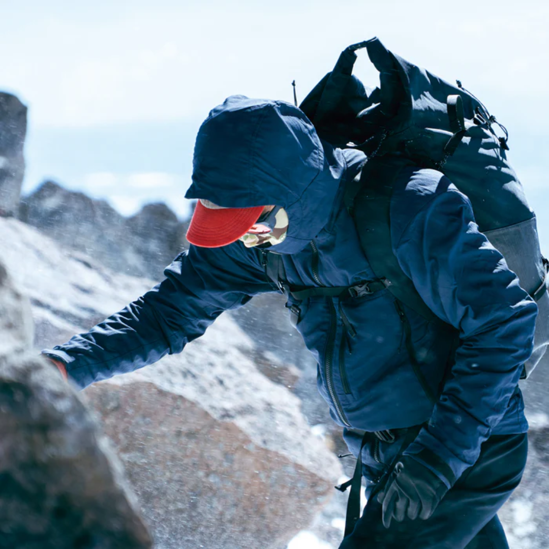 - ヘルメットやニットキャップと重なるフード上部、バックパックのハーネスと重なる腰回り、グローブと重なる袖口周りはOcta®CPCP®を抜いてナイロンシェル地のみ