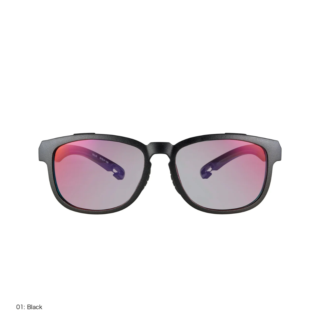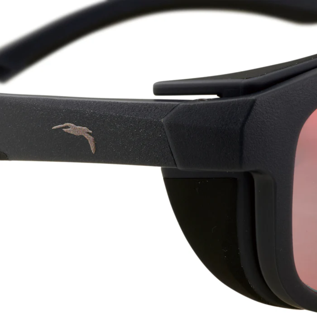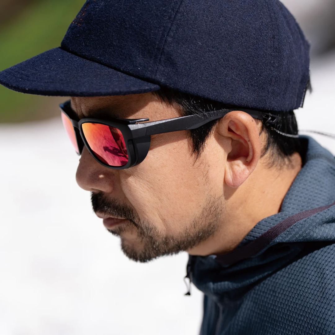 その結果、雪山で威力を発揮する最高峰山岳モデルが完成。偏光+ハイコントラストに加え、特殊レンズやサイドシールドで視界をクリアに確保しフレームのエコ性、カラビナエンド仕様、グラスコード付属と機能を盛り込んでいます。
