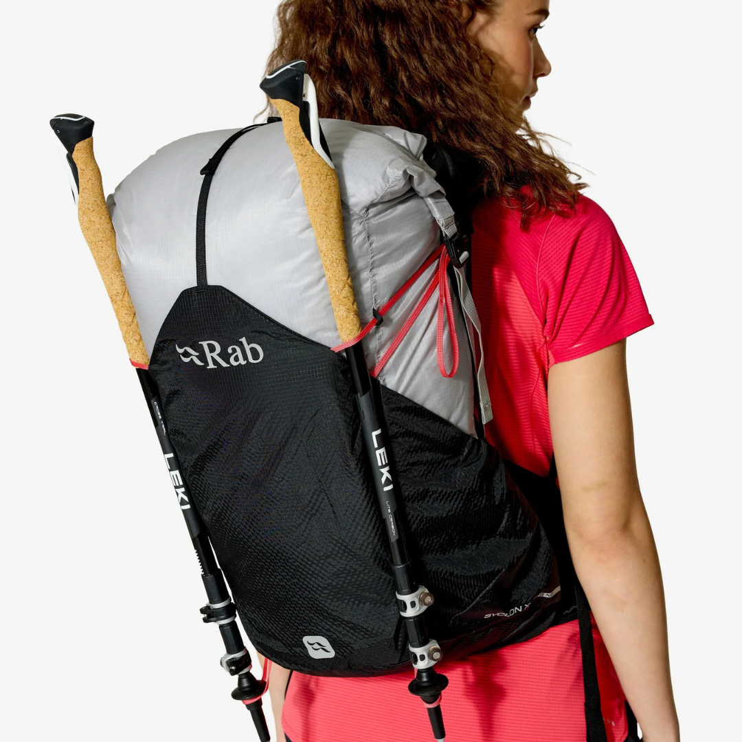 - ハンズフリーが必要な時は、アタッチメントポイントを使用してウォーキングポールをパックに固定。