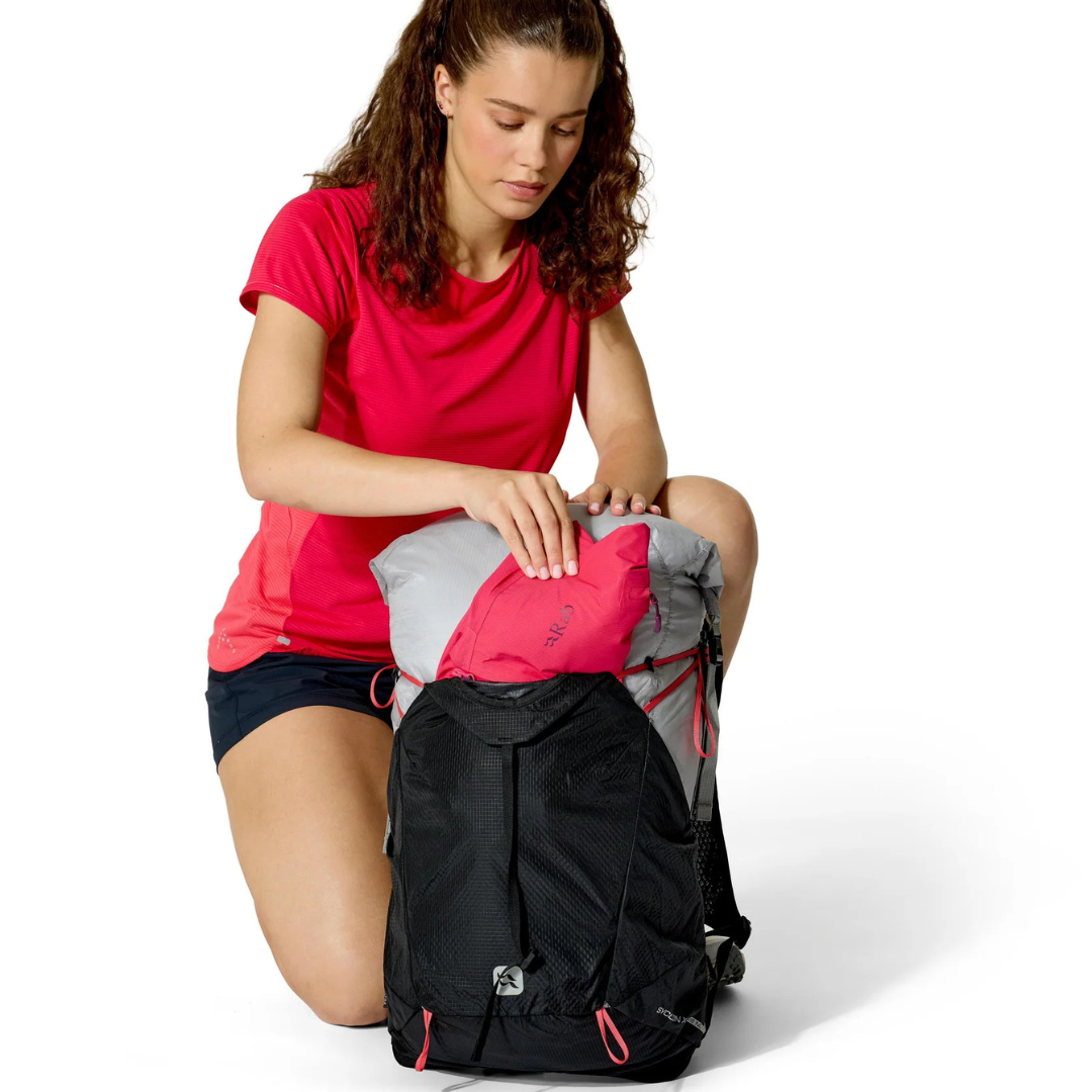 これによりドライバッグやレインカバーが不要となり、さらなる軽量化を達成しています。AEROFIT™キャリーシステムは身体の輪郭に沿い通気性に優れ、背中に十分な空気の流れを確保。